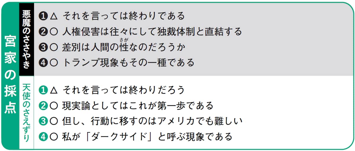 天使のさえずりが常に正しく、悪魔のささやきが常に間違っているという保証はない。悪魔と天使の意見が出揃った後、人権・人種問題の現状を著者が詳しく解説し、最善と考えられる解答を示す。